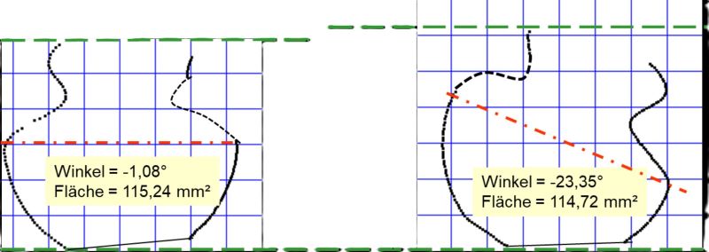 Unsere Abbildung zeigt zwei Ausschnitte eines Querschnitts in einem Streckenabschnitt aus Süddeutschland. Hier zeigt sich ein wesentlicher Vorteil von »CatPro«: die gesamte Erfassung des relevanten Kontaktbereichs statt nur der Länge des Fahrspiegels oder der Höhe des Fahrdrahts. Das Beispiel zeigt, dass die Verdrehung des Fahrdrahts bei Messprinzipien, welche die Höhe erfassen, bei nahezu gleichbleibendem Querschnitt eine Abweichung erzeugt. »CatPro« hingegen kompensiert diese messprinzipbedingt und gibt die Verdrehung des Fahrdrahts als Messwert zur weiteren Verarbeitung aus.