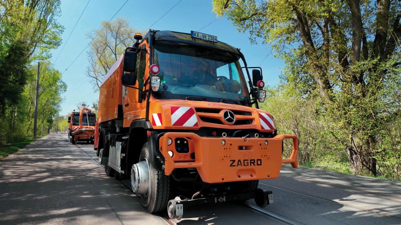 Diese vielseitigen Zweiwegefahrzeuge wurden von dem Unimog ExpertPartner Zargo Bahn- und Baumaschinen GmbH speziell für den Einsatz auf Straßen und Schienen ausgestattet und decken ein breites Spektrum an Einsatzmöglichkeiten ab: von Gleisarbeiten über Wartungs- und Instandhaltungsarbeiten der Oberleitung, Reinigungsaufgaben, Grünpflege, Winterdienst bis hin zu Rangieraufgaben für das Bergen einer ausgefallenen Straßenbahn. Alle vier Unimog haben eine Zagro-Drehschemel-Schienenführung für eine Spurweite von 1435 mm, die für eine präzise Gleisführung vor allem im innerstädtischen Bereich mit engen Kurvenradien bis 17 Meter sorgt. Bei Arbeitseinsätzen im Stadtgebiet mit schmalen Straßen oder Haltestellenbereichen kann der Unimog dank kompakter Abmessungen zusätzlich mit seiner Wendigkeit punkten. Je nach Anwendung lässt sich die optimale Arbeitsgeschwindigkeit durch den optionalen hydrostatischen Fahrantrieb »EasyDrive« stufenlos anpassen.