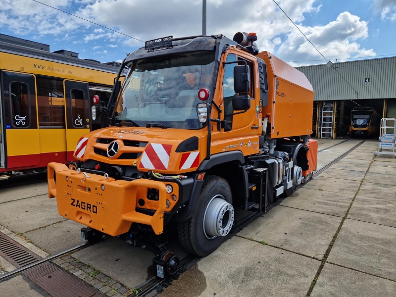 Vier Zweiwege-Unimogs der Verkehrsbetriebe Karlsruhe halten Straßen und Gleise instand. Die multifunktionalen Fahrzeuge punkten mit modernster Technik für Reinigung, Wartung, Grünpflege, Winterdienst und Notfalleinsätze im städtischen Schienennetz.