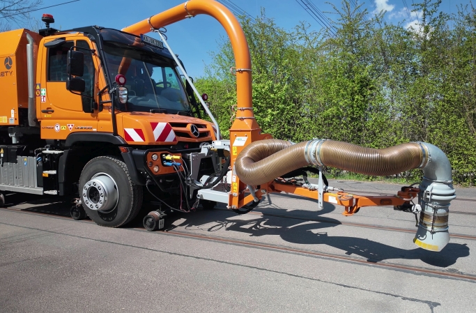 Die beiden Zweiwege-Reinigungsfahrzeuge basieren auf dem Unimog »U 423«. Sie sind mit einer Vielzahl von spezialisierten Geräten ausgestattet, die eine effiziente und gründliche Reinigung ermöglichen. Zu den Hauptkomponenten der Fahrzeuge gehören das Autech-Schleifpflegemodul, eine Trilety-Aufsatzkehrmaschine und das Saugüberladegebläse der HEN AG. Das Schleifpflegemodul sorgt für die Reinigung und Pflege der Schienenfahrköpfe. Es entfernt etwa Verunreinigungen wie Laub, Teer, Gummiabrieb oder Fugenbandreste – ideal für städtische Bereiche mit hohem Reinigungsbedarf. Mit der Aufsatzkehrmaschine reinigt der Unimog im Straßenbahnnetz zwischen den Schienen und die Rillenschienen oder hält Verkehrsflächen von Straßenbahndepots oder Busbahnhöfen sauber. In Kombination mit dem Saugüberladegebläse kann die Kehrmaschine Laub, Müll und andere Verunreinigungen effizient aufnehmen und in einen Sammelbehälter überführen. Als Ergänzung des Kehr- und Saugaufbaus dient der Trilety-Schienenrillen-Reinigungsanhänger für die Reinigung von Gleisanlagen, die insbesondere stark frequentiert oder schwer zugänglich sind, wie beispielsweise bei Weichen oder Kreuzungen. Die Absaugung erfolgt über große Saugschläuche in den Schmutzbehälter. Hartnäckige Ablagerungen können darüber hinaus mit einer Hochdruck-Wasseranlage mit bis zu 400 bar Druck entfernt werden. Weitere Merkmale sind die hydraulische Nothandpumpe, die elektrische Überbrückungseinrichtung und die Erdungseinrichtung, die für den sicheren Betrieb unter Oberleitungen sorgt.